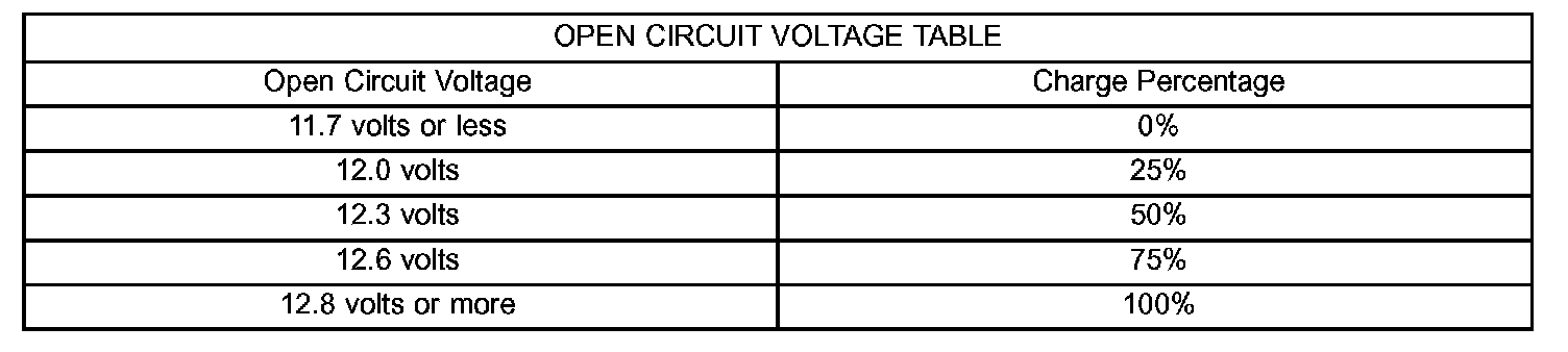 See the Open-Circuit Voltage Table. This voltage reading will indicate the battery state-of-charge, but will not reveal its cranking capacity. If a battery has an open-circuit voltage reading of 12.4 volts or greater, it may be load tested to reveal its cranking capacity.