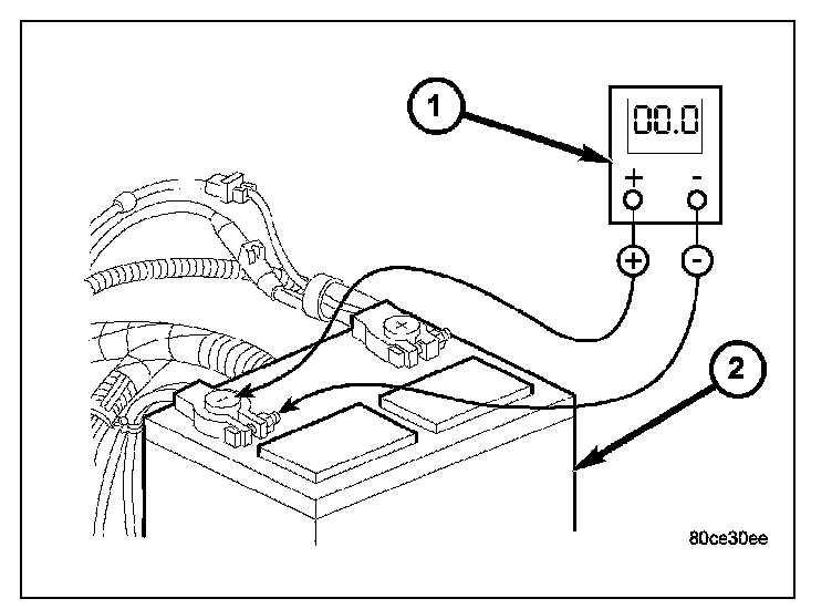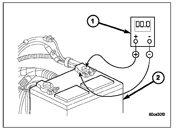 2. Connect positive lead of voltmeter (1) to positive battery terminal post. Connect negative lead of voltmeter to battery positive cable clamp. Rotate and hold ignition switch in Start position. Observe voltmeter (1). If voltage is detected, correct poor contact between cable clamp and terminal post.