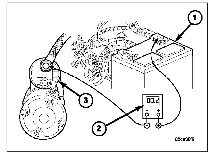 3. Connect voltmeter (2) to measure between battery positive terminal post and starter solenoid battery terminal stud (3). Rotate and hold ignition switch in Start position. Observe voltmeter. If reading is above 0.2 volt, clean and tighten battery cable connection at solenoid. Repeat test. If reading is still above 0.2 volt, replace faulty positive battery cable.