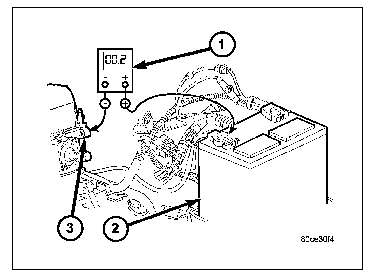 5. Connect positive lead of voltmeter (3) to starter housing (1). Connect negative lead of voltmeter to negative battery terminal post. Rotate and hold ignition switch in Start position. Observe voltmeter. If reading is above 0.2 volt, correct poor starter to engine block ground contact.
