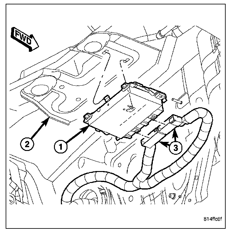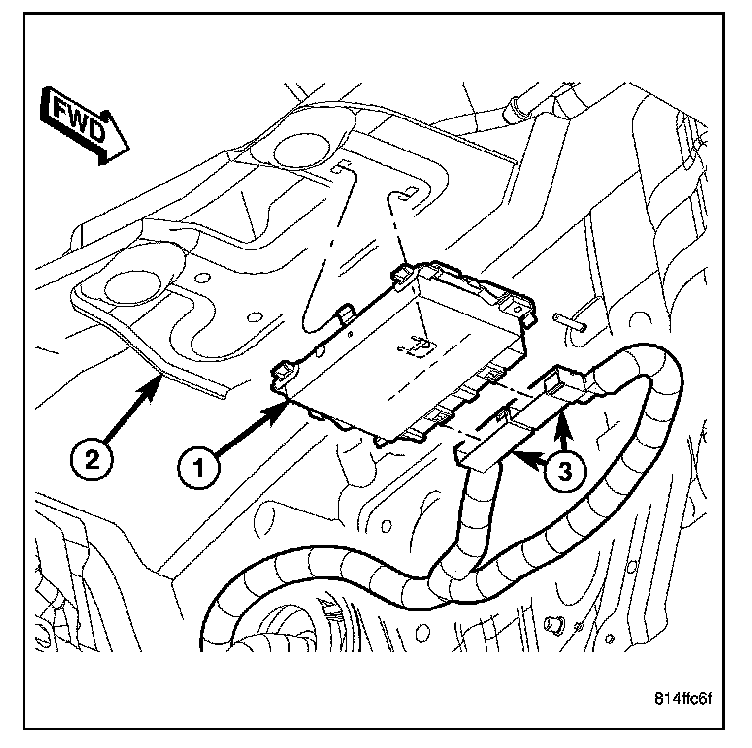 REMOVAL1. Locate the transmission control module on the dash panel, under the dash panel silencer pad (2), just to the right of the steering column.