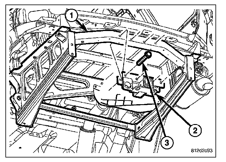 1. Install the hitch (2) onto the rear body cradle (1) and install the bolts (3).
