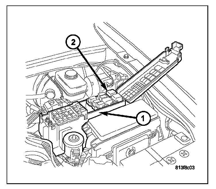 1. Position the blower motor relay (2) into the proper receptacle of the PDC (1).