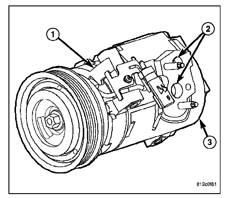 The A/C system uses a Denso 10S17C ten cylinder, double-acting swash plate-type A/C compressor (1). This A/C compressor has a fixed displacement of 170 cubic centimeters (10.374 cubic inches), and has both the suction and discharge ports (2) located on the cylinder head (3) at the rear of the compressor.