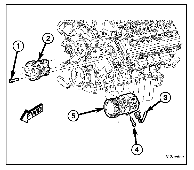 2. Install the bolts (4) that secure the A/C compressor to the engine. Tighten the bolts to 55 N.m (41 ft. lbs.).
