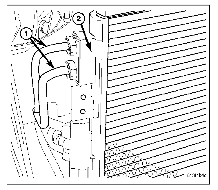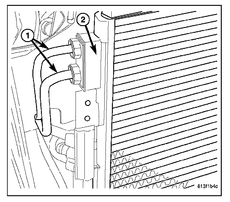 7. Connect the automatic transmission cooler lines (1) to the transmission fluid cooler (2).