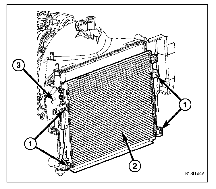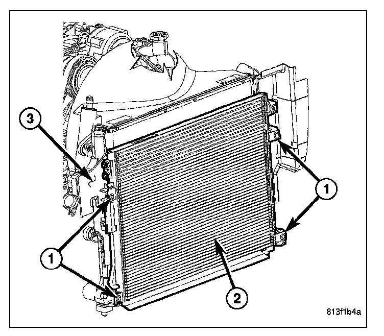 1. Carefully position the A/C condenser (2) onto the radiator (3).