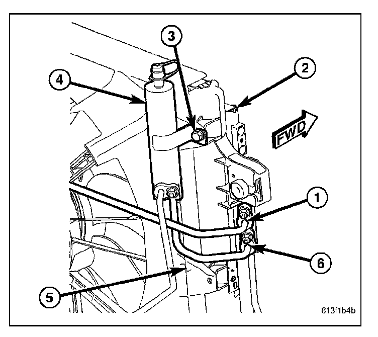 10. Loosen the screw (3) that secures the receiver/ drier (4) to the radiator and fan shroud (5).