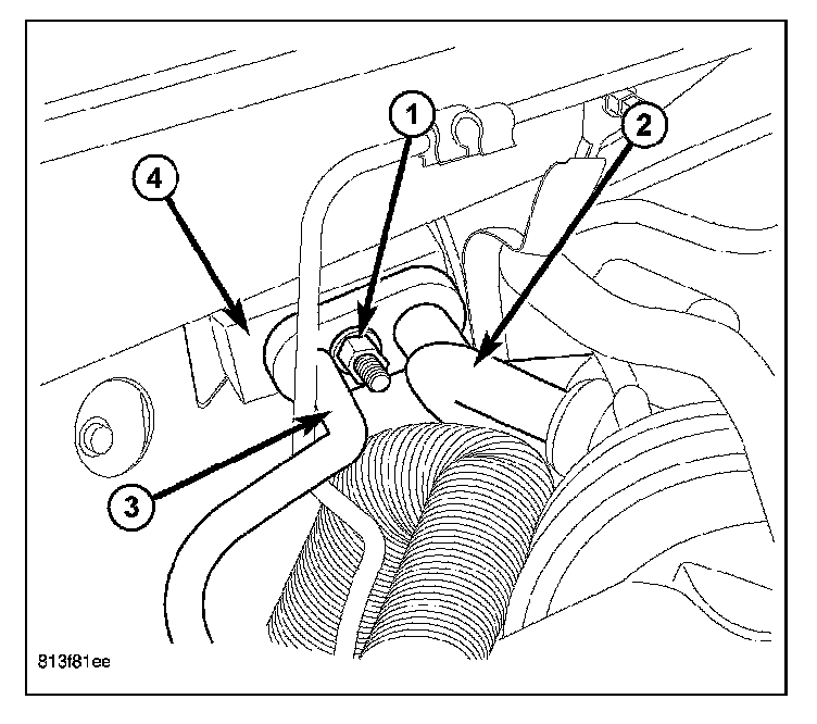 4. Remove the nut (1) that secures the A/C suction line (2) and the A/C liquid line (3) to the A/C expansion valve (4).