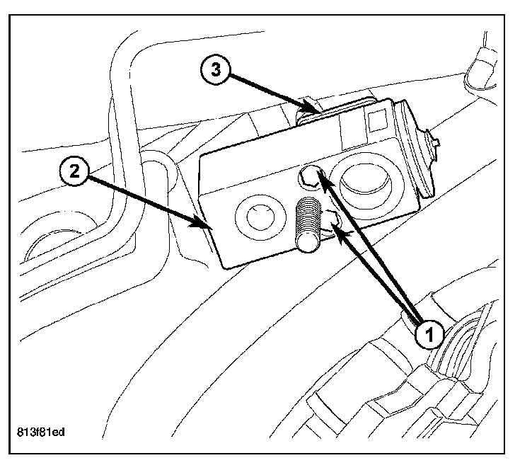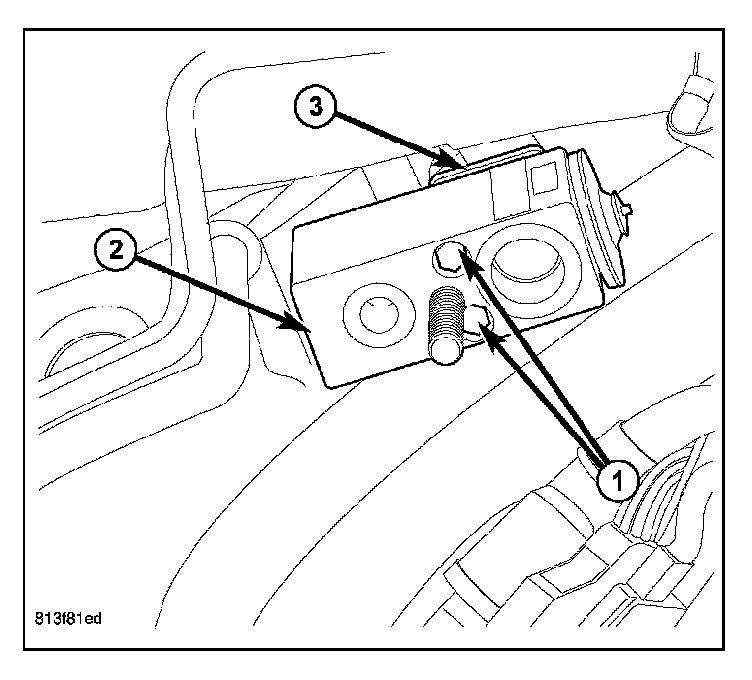 7. Remove the two bolts (1) that secure the A/C expansion valve (2) to the evaporator tube tapping block (3).