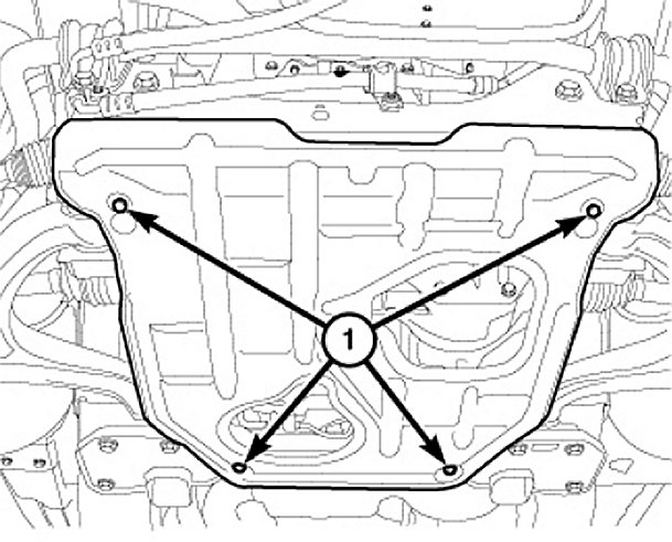 3. Remove the lower splash shield retaining bolts (1) and the splash shield.