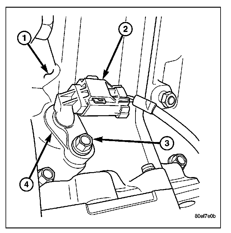 The Crankshaft Position (CKP) sensor (4) is located at the right-rear side of the engine cylinder block (1). It is positioned and bolted into a machined hole in the engine block.