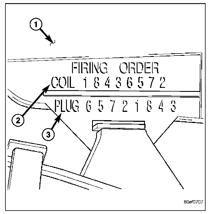 Eight conventional spark plug cables are used with the 5.7L. These cables connect a coil on one cylinder bank, directly to a spark plug on the opposite cylinder bank. The cables are placed and routed in a special plastic loom to keep them separated. This loom is clipped to the intake manifold. To prevent a miss-match of cables, a corresponding spark plug / coil number is displayed on each plug cable: 1/6, 2/3, 4/7 and 5/8. These numbers (2) and (3) can also be found on the top of the intake manifold (1) to the right of the throttle body.