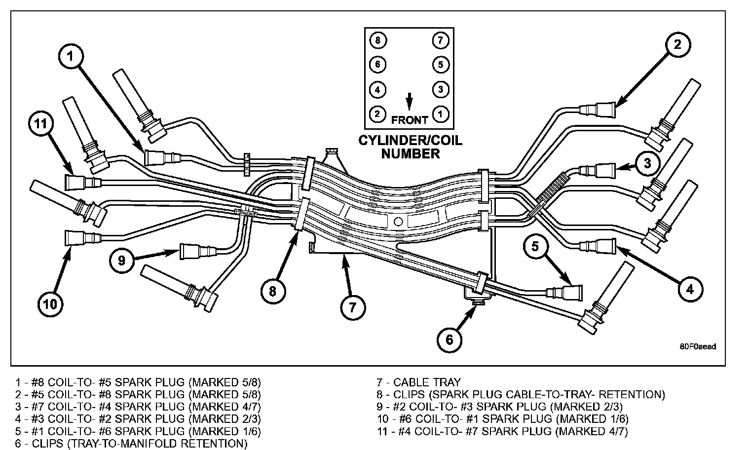 Spark plug cables on the 5.7L engine are paired on cylinders 1/6, 2/3, 4/7 and 5/8. Before removing or disconnecting any spark plug cables, note their original position. Remove cables one-at-a-time. To prevent ignition crossfire, spark plug cables MUST be placed in cable tray (routing loom) into their original position. The cable retention clips (6) and (8) must also be securely locked.