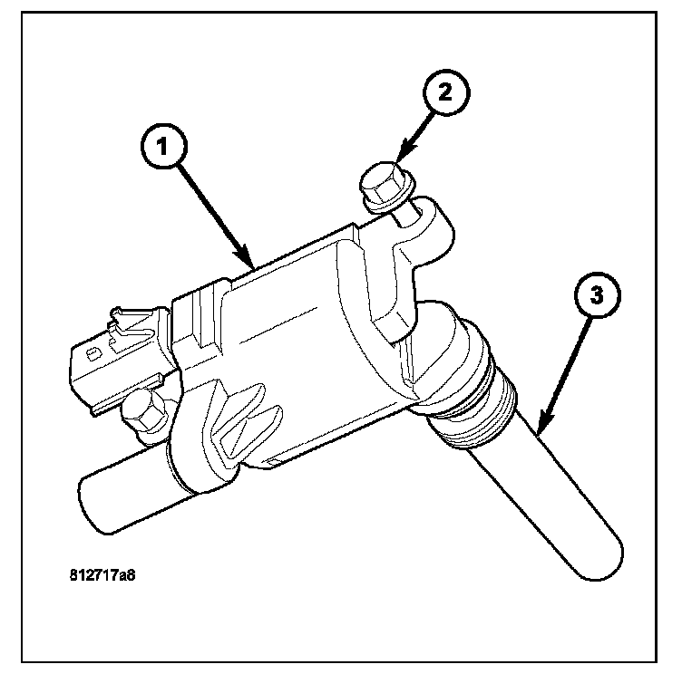 An individual ignition coil (1) is used at each cylinder. The coil mounts to the top of the valve cover with two bolts (2). The bottom of the coil is equipped with a rubber boot (3) to seal the spark plug to the coil. Inside each rubber boot is a spring. The spring is used for a mechanical contact between the coil and the top of the spark plug.