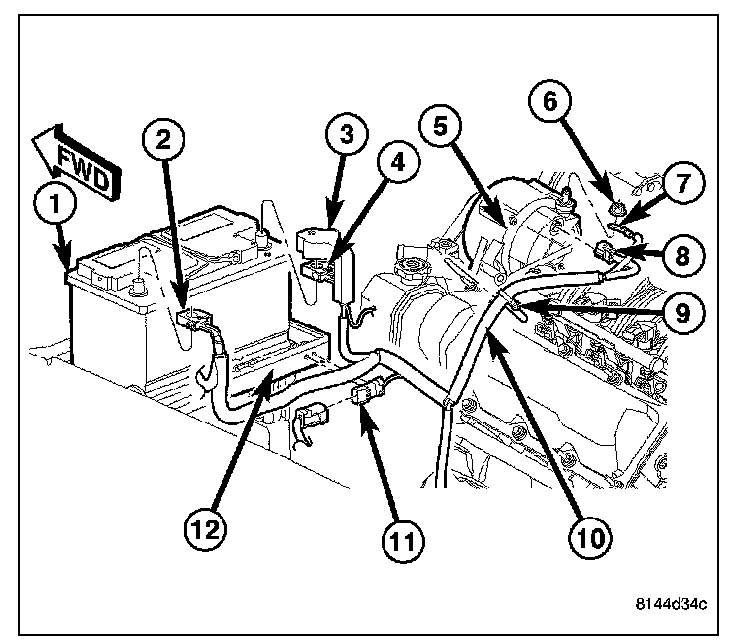 5. Install and tighten the two screws (3) that secures the battery tray (4) to the inner fender and the bracket on the radiator support. Tighten the screw to 7.3 Nm (65 in. lbs.).