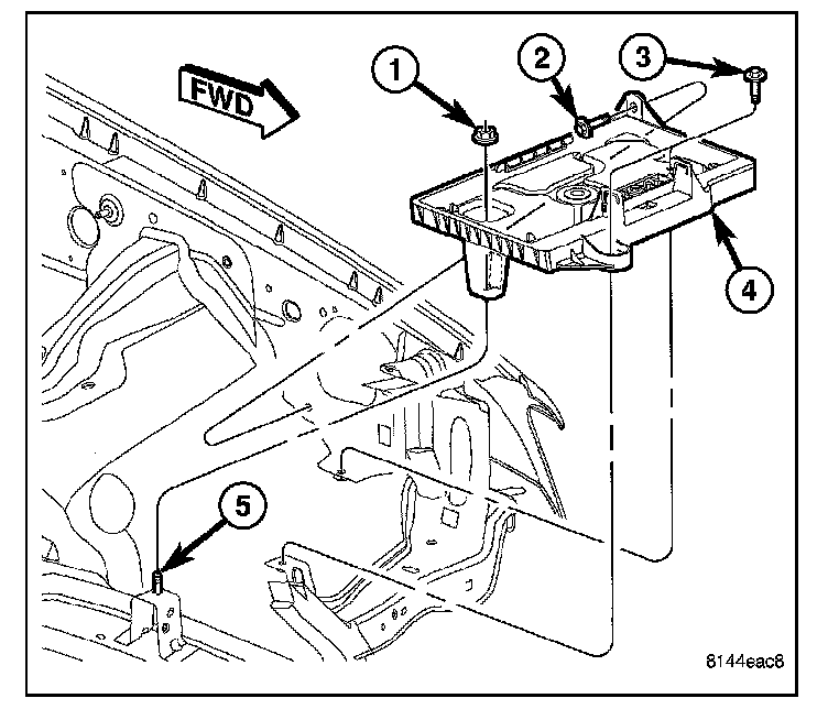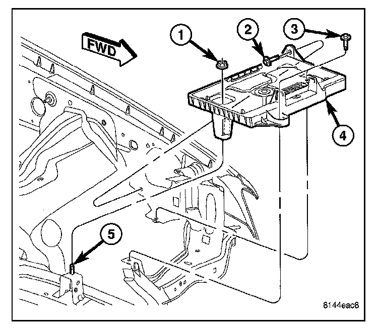 5. Remove the one nut (1) that secures the rear of the battery tray to the stud (5) on the front frame rail.