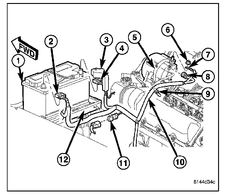 6. Install the battery wire harness three pin connector (11) onto the battery tray (12).