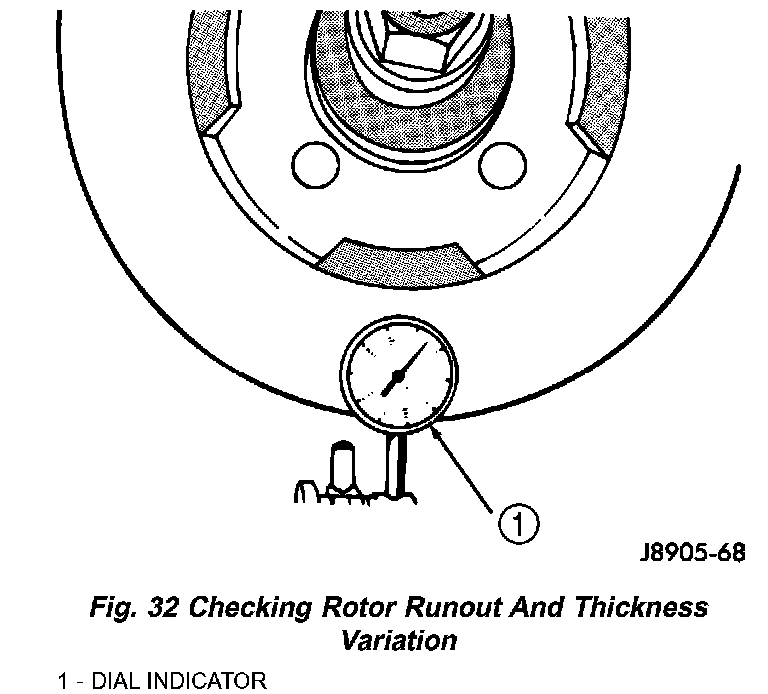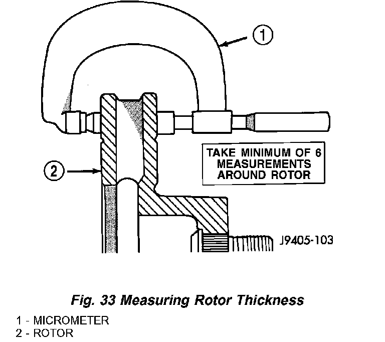 Measure rotor thickness at 6 to 12 points around the rotor face (Fig. 33).