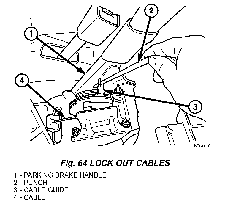 2. Pull up on the spring until the tab on the lever passes the tab on the cable guide (3) and install a punch (2) in the hole on the side then release (Fig. 64).