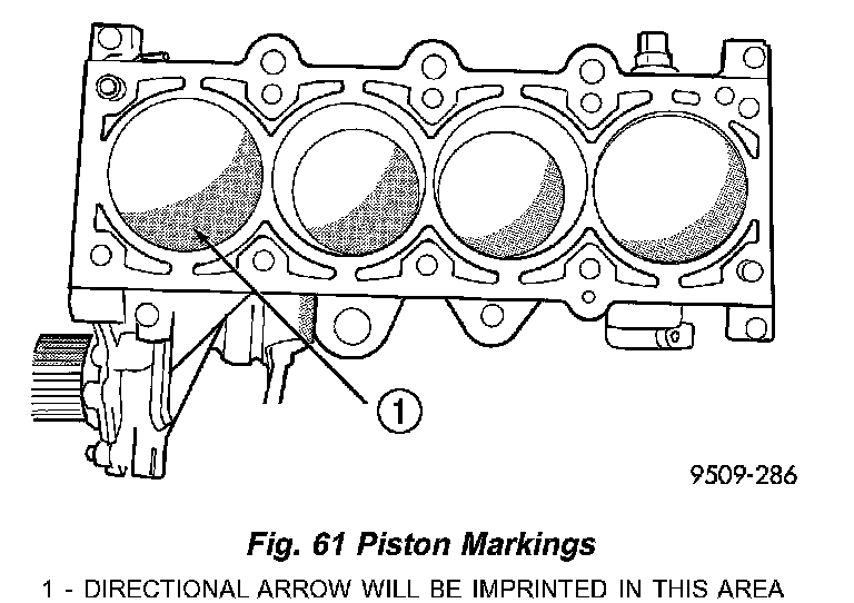 1. Remove top ridge of cylinder bores with a reliable ridge reamer before removing pistons from cylinder block. Be sure to keep tops of pistons covered during this operation. Mark piston with matching cylinder number (Fig. 61).