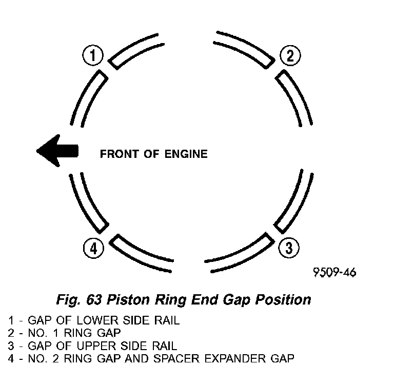 2. Before installing the ring compressor, make sure the oil ring expander ends are butted and the rail gaps located as shown in (Fig. 63). As viewed from top.