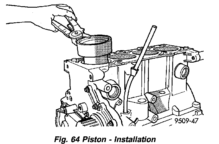 3. Immerse the piston head and rings in clean engine oil, slide the ring compressor, over the piston (Fig. 64). Be sure position of rings does not change during this operation.