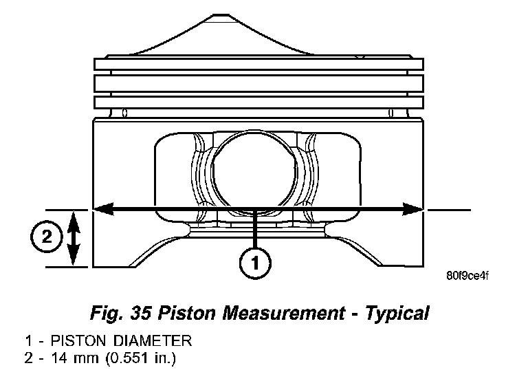 STANDARD PROCEDURE - PISTON TO CYLINDER BORE FITTINGPiston and cylinder wall must be clean and dry. Piston diameter should be measured 90 degrees to piston pin about 14 mm (9/16 inch) from the bottom of the skirt as shown in (Fig. 35). Cylinder bores should be measured halfway down the cylinder bore and transverse to the engine crankshaft center line shown in (Fig. 34). Refer to Engine Specifications. Correct piston to bore clearance must be established in order to assure quiet and economical operation.