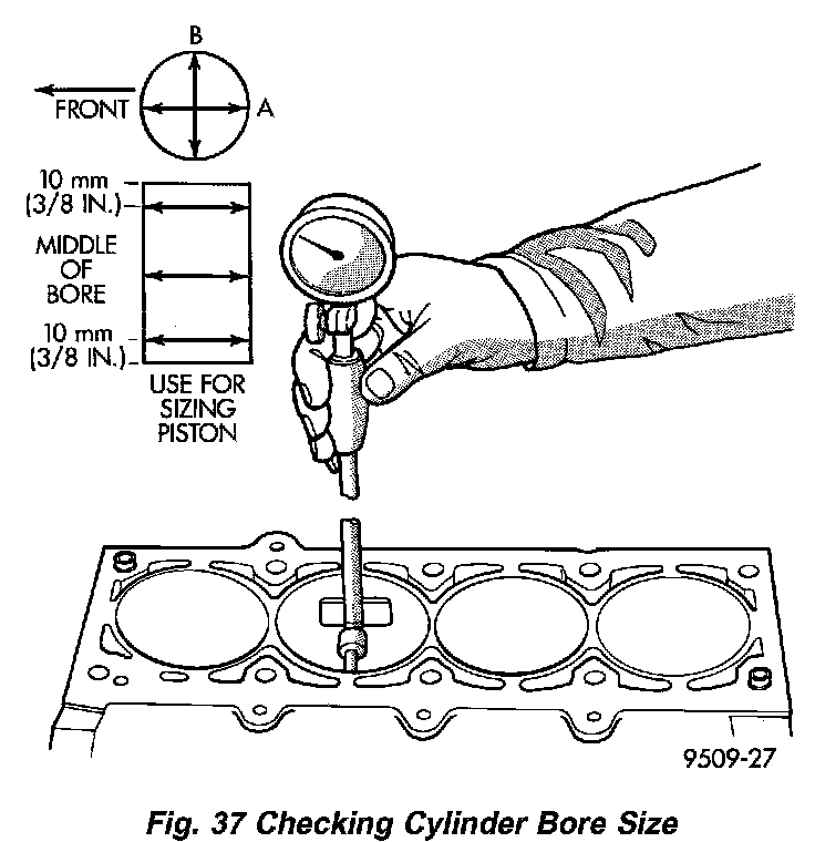 Measure the cylinder bore at three levels in directions A and B (Fig. 37). Top measurement should be 10 mm (3/8 inch) down and bottom measurement should be 10 mm (3/8 inch) up from bottom of bore.