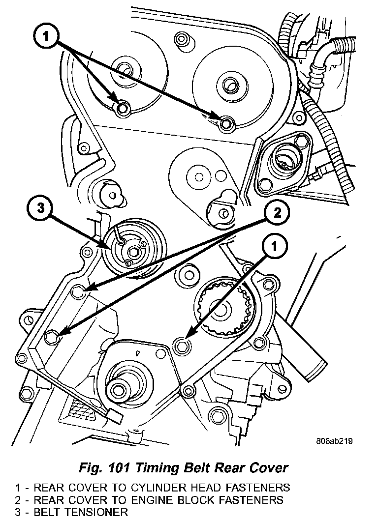 1. Install timing belt rear cover and bolts (Fig. 101).