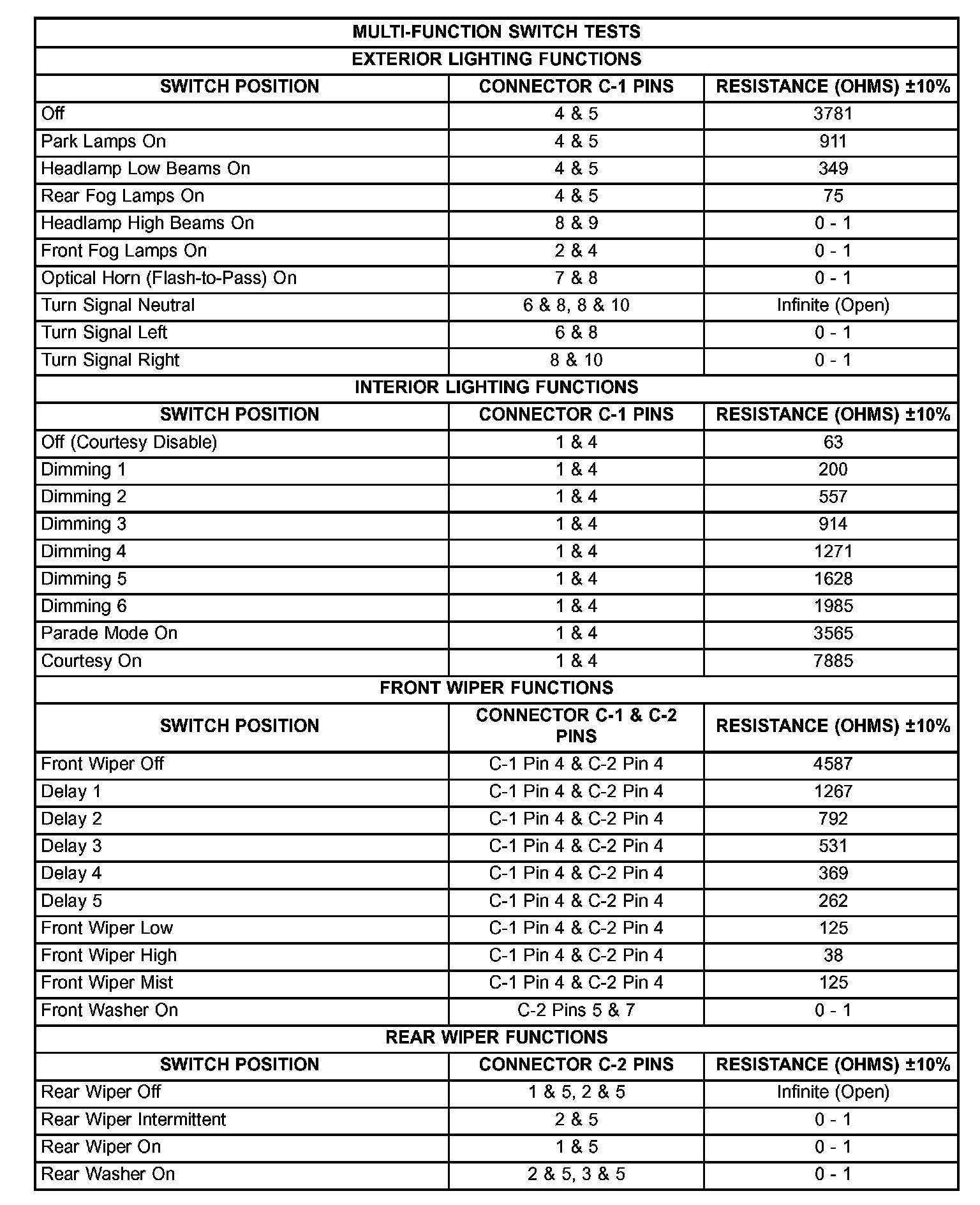 3. Using an ohmmeter, perform the continuity and resistance tests at the terminals in the multi-function switch connector as shown in the Multi-Function Switch Tests table.