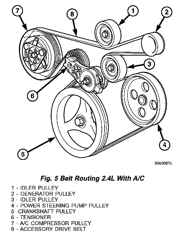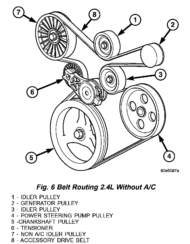 2. Install new belt (Fig. 5) or (Fig. 6). Route the belt around all pulleys except the idler pulley. Rotate the tensioner arm until it contacts its stop position. Route the belt around the idler and slowly let the tensioner rotate into the belt. Make sure the belt is seated onto all pulleys.