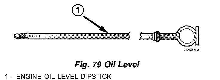 Checking the oil while the vehicle is on level ground will improve the accuracy of the oil level reading. Remove dipstick and observe oil level. Add oil only when the level is at or below the ADD mark (Fig. 79).