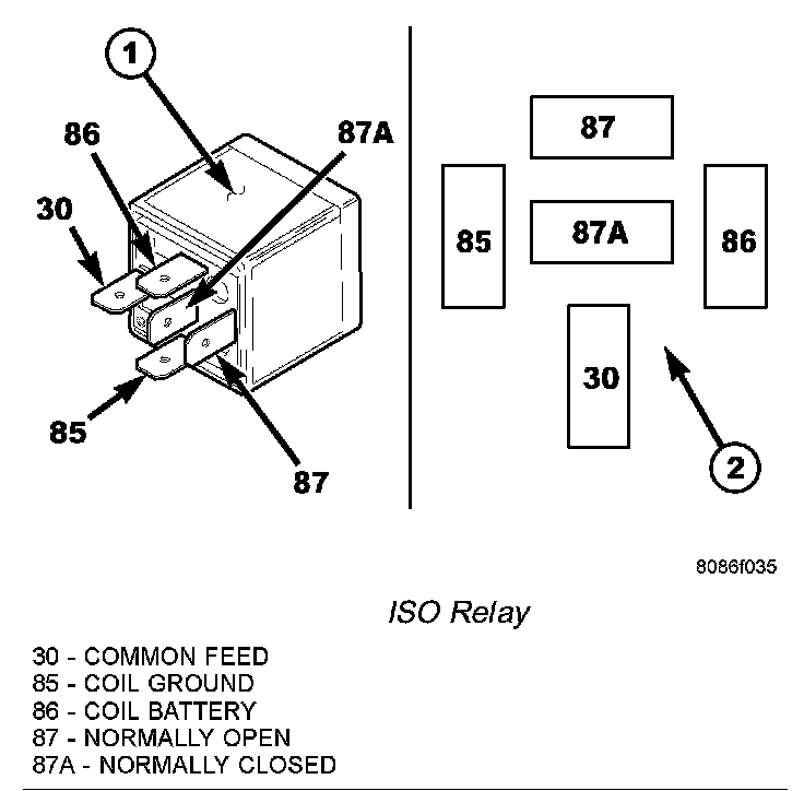 The ISO relay consists of an electromagnetic coil, a resistor and three (two fixed and one movable) electrical contacts. The movable (common feed) relay contact is held against one of the fixed contacts (normally closed) by spring pressure. When the electromagnetic coil is energized, it draws the movable contact away from the normally closed fixed contact, and holds it against the other (normally open) fixed contact.