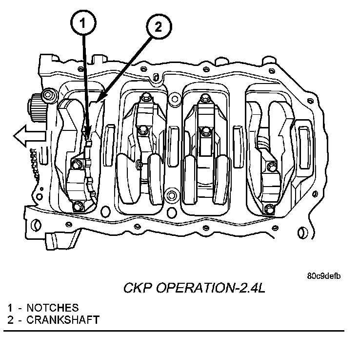 Engine speed and crankshaft position are provided through the CKP (Crankshaft Position) sensor. The sensor generates pulses that are the input sent to the Powertrain Control Module (PCM). The PCM interprets the sensor input to determine the crankshaft position. The PCM then uses this position, along with other inputs, to determine injector sequence and ignition timing.