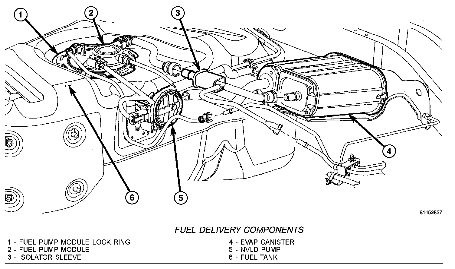 The fuel pump module assembly (2). is located on top of the fuel tank.