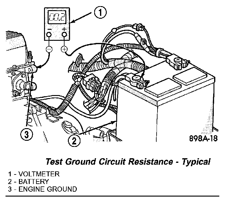1. Connect the positive lead of the voltmeter to the battery negative terminal post Connect the negative lead of the voltmeter to the battery negative cable terminal clamp. Rotate and hold the ignition switch in the Start position Observe the voltmeter. If voltage is detected, correct the poor connection between the battery negative cable terminal clamp and the battery negative terminal post.