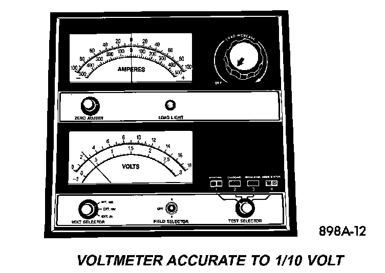 1. Measure the voltage at the battery posts with a voltmeter, accurate to 1/10 (0.10) volt. Refer to Battery REMOVAL and INSTALLATION for access instructions. If the reading is below ten volts, the battery charging current will be low. It could take several hours before the battery accepts a current greater than a few milliamperes. Such low current may not be detectable on the ammeters built into many battery chargers.
