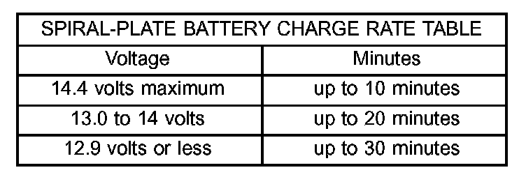 3. Battery chargers vary in the amount of voltage and current they provide. The amount of time required for a battery to accept measurable charging current at various voltages is shown in the Charge Rate Table. If the charging current is still not measurable at the end of the charging time, the battery is faulty and must be replaced. If the charging current is measurable during the charging time, the battery may be good and the charging should be completed in the normal manner.