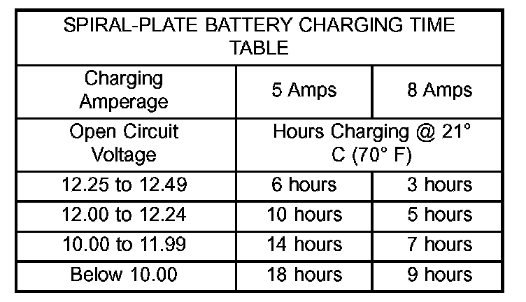 Vehicles equipped with a diesel engine utilize a unique spiral plate battery. This battery has a maximum charging voltage that must not be exceeded in order to restore the battery to its full potential, failure to use the following spiral plate battery charging procedure could result in damage to the battery or personal injury.Battery charging is the means by which the battery can be restored to its full voltage potential. A battery is fully-charged when: