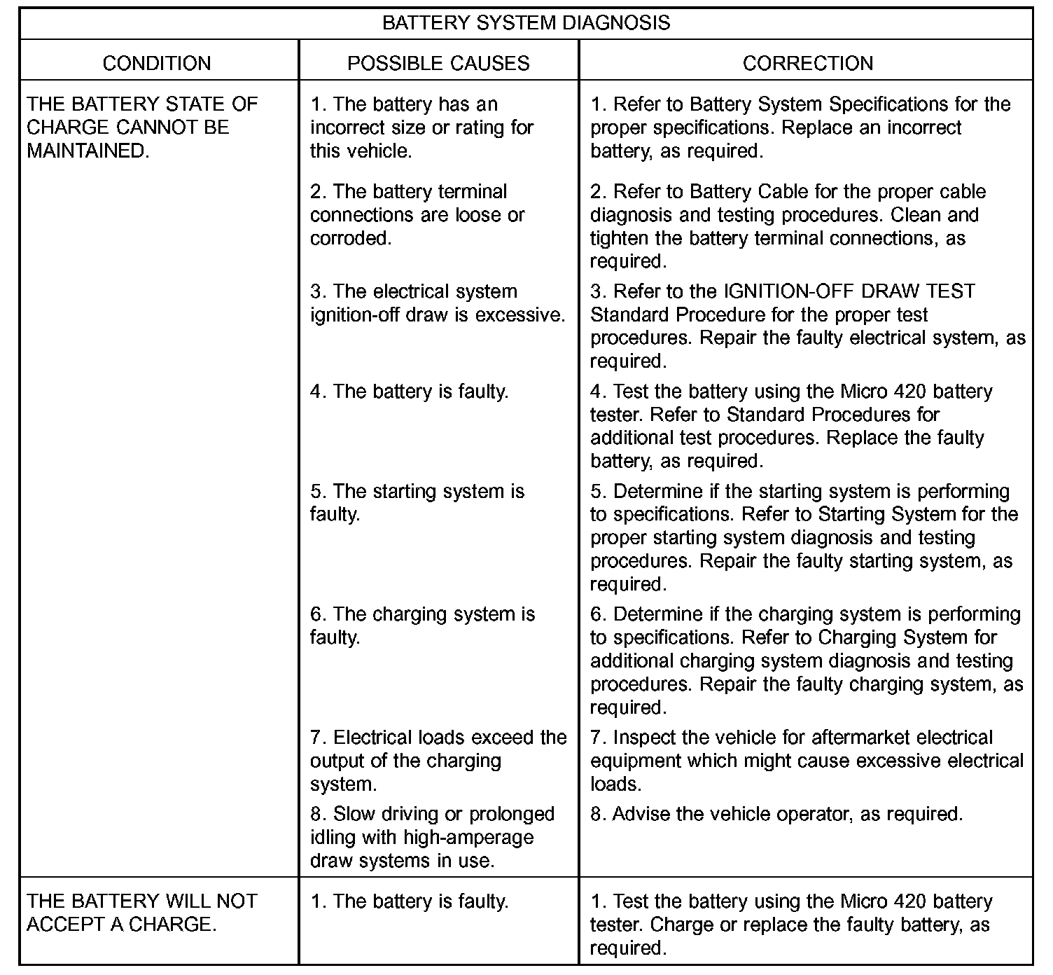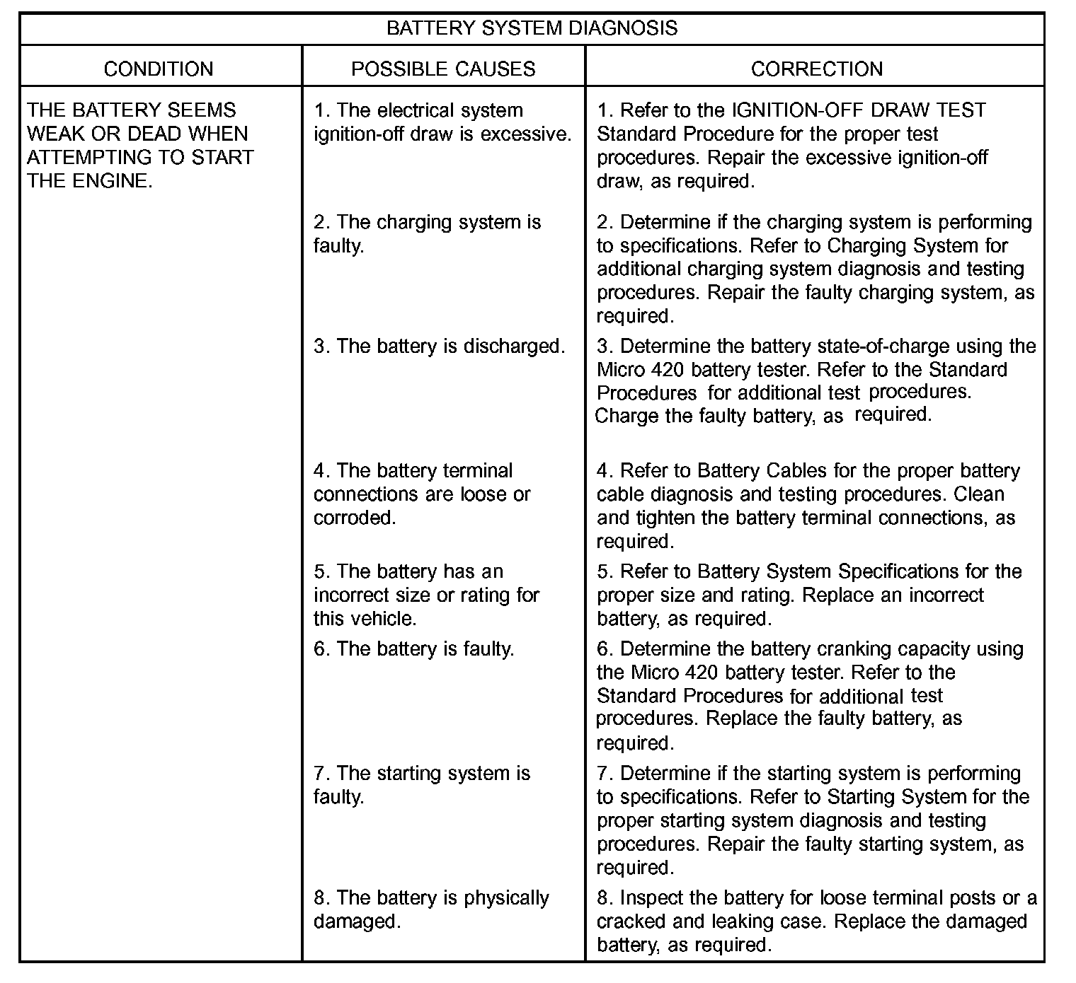 2. A faulty or incorrect battery. Use Micro 420 battery tester and refer to Battery System for additional battery diagnosis and testing procedures.