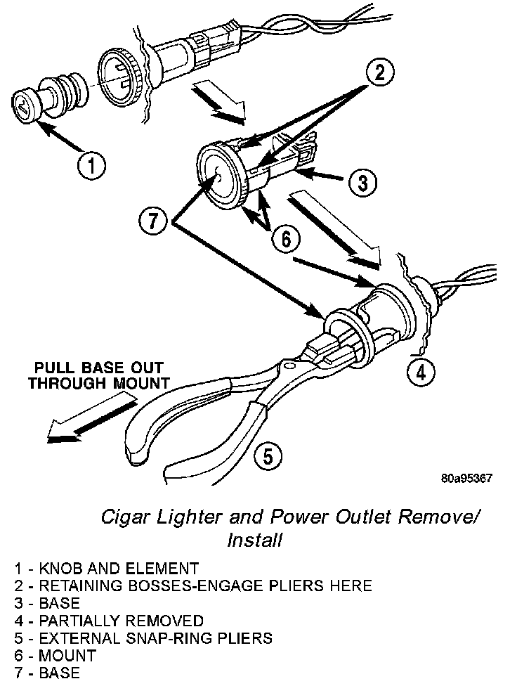 4. Insert a pair of external snap ring pliers into the cigar lighter or power outlet receptacle base and engage the tips of the pliers with the retaining bosses of the mount.