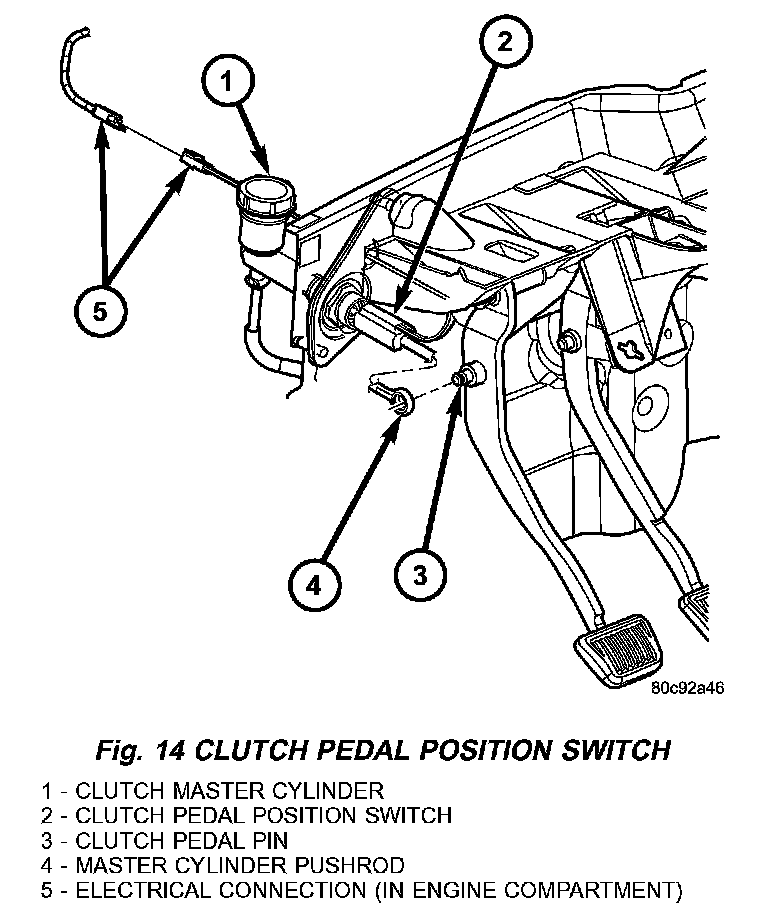 The clutch pedal position switch (2) is located under the instrument panel, attached to the clutch master cylinder (1) push rod (Fig. 14). The wiring harness connection for the switch is in the engine compartment (Fig. 14).