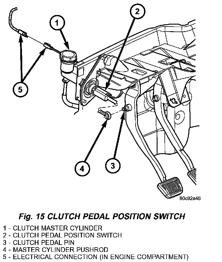 CLUTCH PEDAL POSITION SWITCH1. Disconnect switch 2-wire connector (5) in engine compartment (Fig. 15).