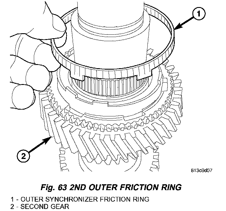 5. Install outer synchronizer friction ring (1) (Fig. 63) on second gear (2).