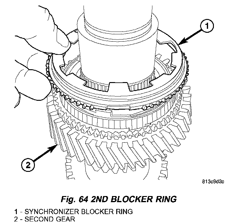 6. Install synchronizer blocker ring (1) (Fig. 64) on second gear (2).