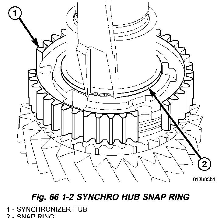 8. Install 1-2 synchronizer hub (1) (Fig. 66) snap-ring (2).