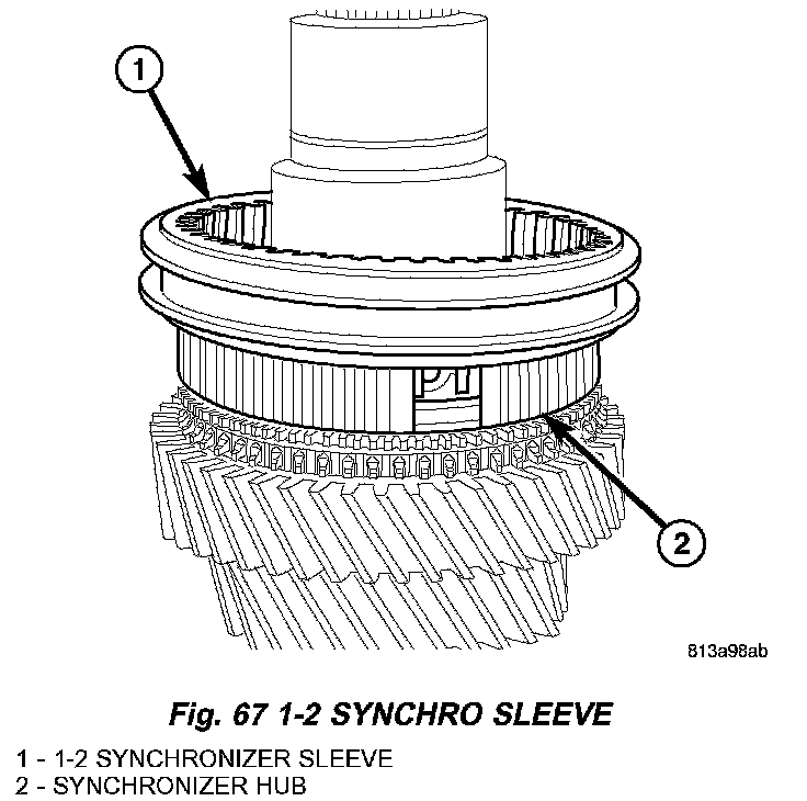 9. Install 1-2 synchronizer sleeve (1) (Fig. 67) and push to the bottom of the synchronizer hub (2).