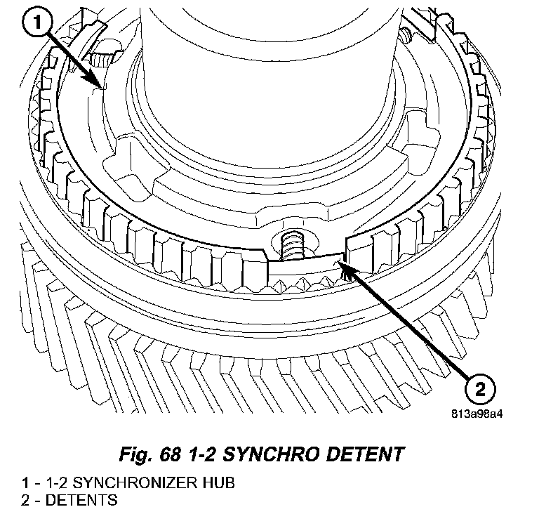 10. Install 1-2 synchronizer detents, springs, and balls (2) (Fig. 68).