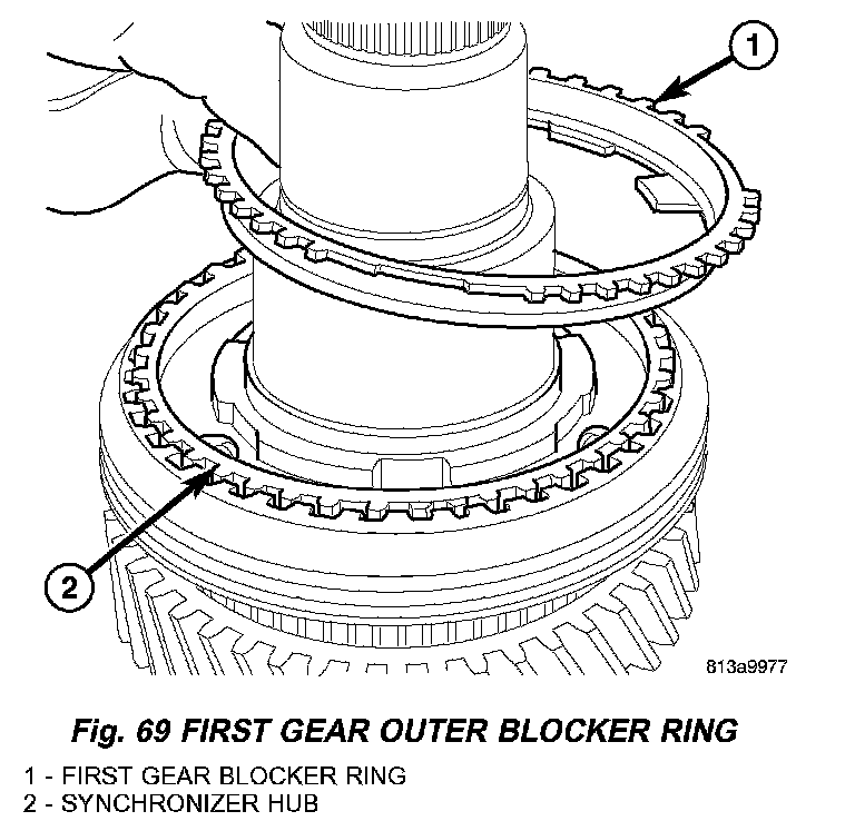 11. Install first gear blocker ring (1) (Fig. 69) into synchronizer hub (2).